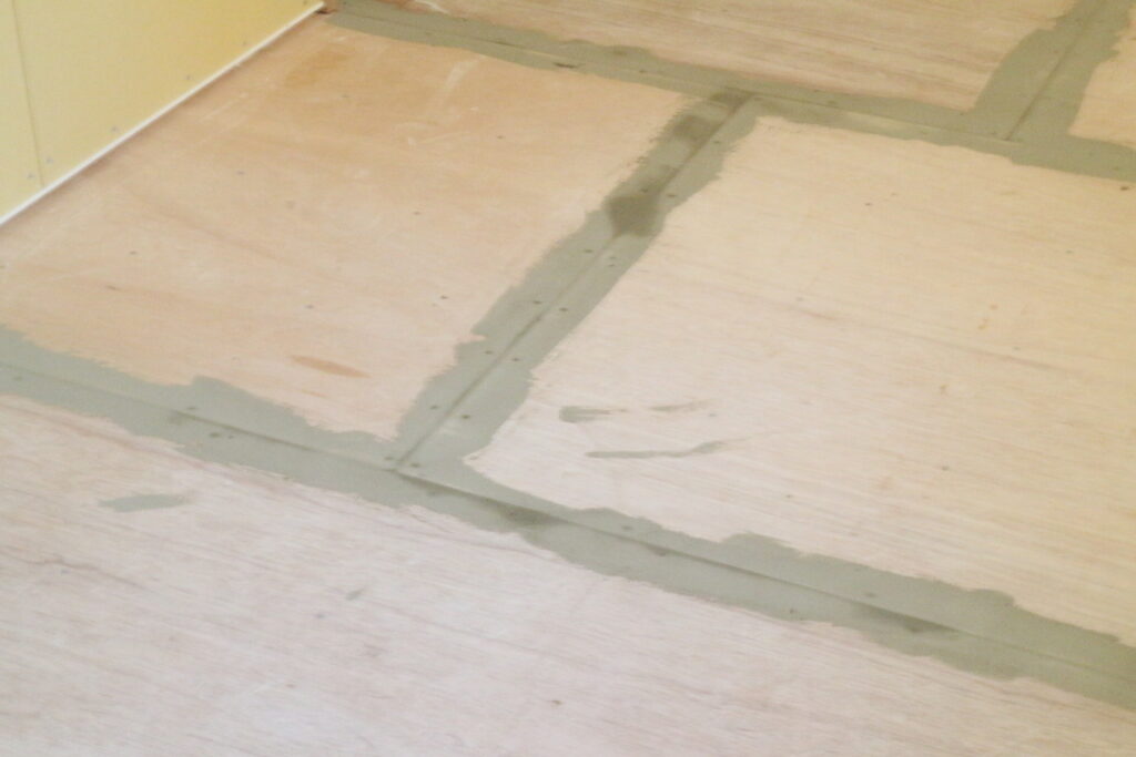 合板の継ぎ目はどうしても僅かな不陸ができてしまうので、パテ処理をして