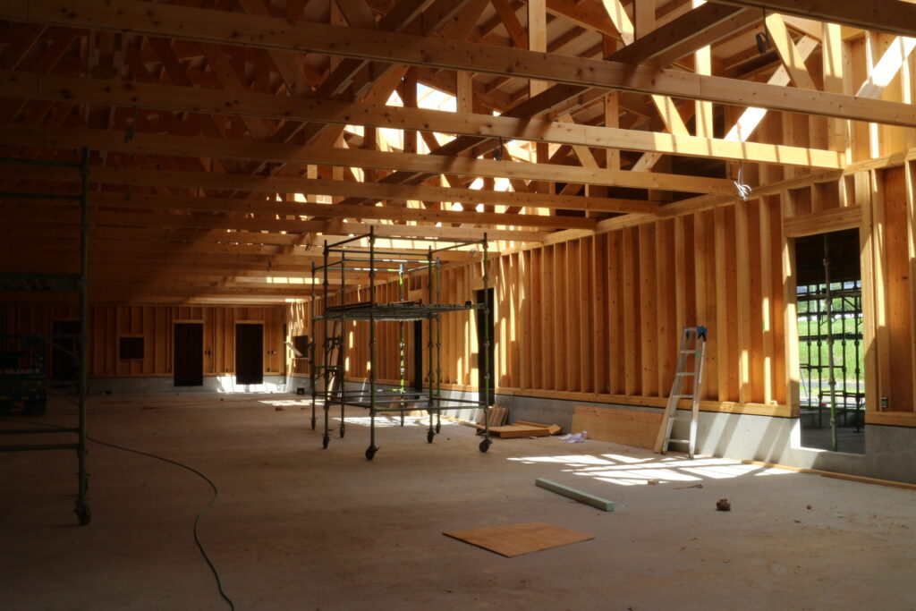2025-07-18 現場レポート:内田縫製 新工場 内田縫製 新工場 屋根工事 内田縫製 新工場は無事に上棟が終わり、屋根工事を進めています。 とても大きな切妻屋根を、ガルバリウム鋼板で仕上げます。北面にはドーマー窓があります。 暑い中、日焼け対策をしっかりとした上で作業を進めて頂いてます。頭が上がりません。。。 内部はこのようになっています。配線工事を進めるため、可動式の足場を使用しています。屋根工事と同時に、電気配線工事をこの後も進めていく予定です。