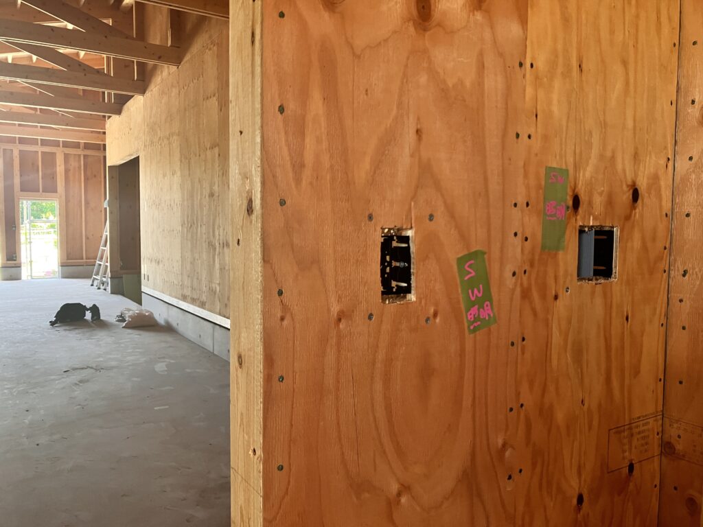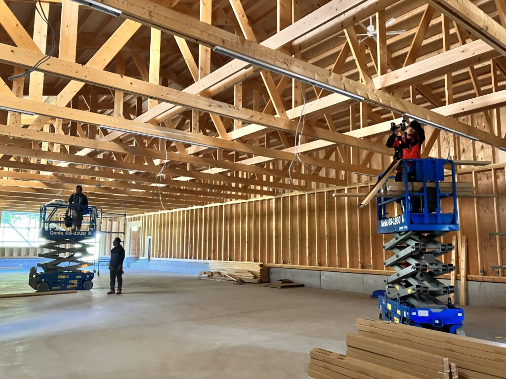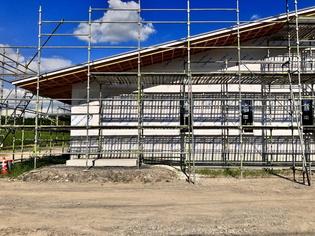 2025-08-05 現場レポート:内田縫製 新工場 内田縫製 新工場 外壁、電気設備工事 内田縫製 新工場は引き続き電気配線工事を行っています。 照明器具は、トラスの下端に直接取付を行っています。配線のルートや取付方法などを構造図の段階から検討して頂いてました。 スイッチやコンセントの配線も同時に進めています。 外回りは透湿防水シートを貼り終えた段階です。これから外壁もどんどん仕上がっていく予定です。