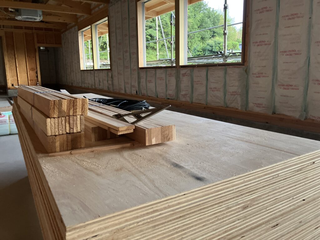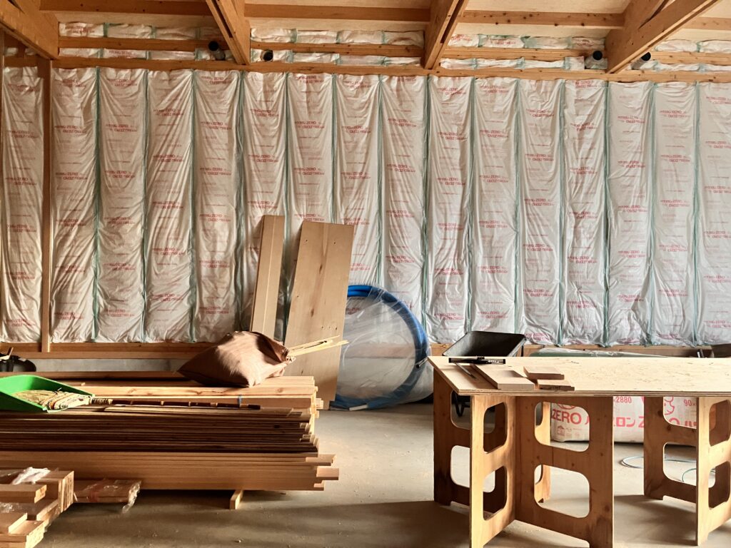 2025-09-05 現場レポート:内田縫製 新工場 内田縫製 新工場 木工事 内田縫製 新工場は設備工事と同時に木工事も進めています。 外周部には断熱材を敷き詰めていきます。 壁には桧合板を仕上げとして貼る予定です。どのようになるのか、楽しみです。