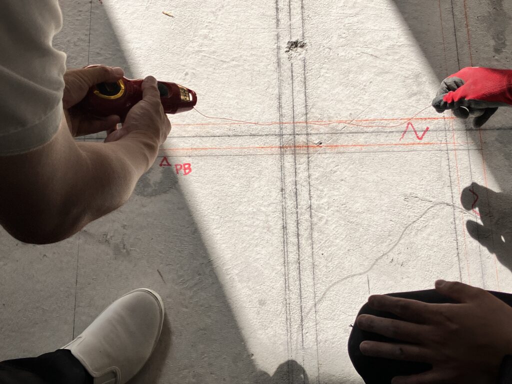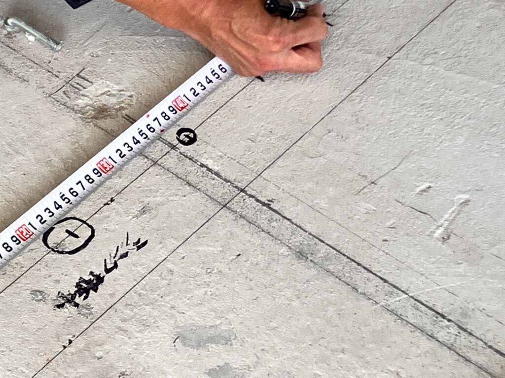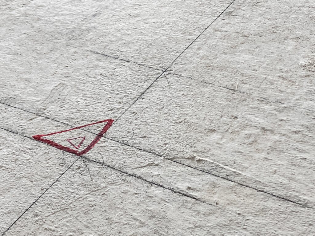 2025-10-13 現場レポート:ショールーム マンションリノベーション マンションリノベーション 墨出し 岡山市で進んでいるマンションリノベーションの工事は、解体工事が完了しました。 解体工事が終わったら、次は墨出しです。この後の工事の進め方に大きく影響する大切な工程です。 キッチンの形状も分かるように、赤い三角形で印をつけました。ここで間違えてしまうとすべてが狂ってしまうので、図面を何度も確認しながら墨を付けていきます。 壁の位置はもちろんですが、給排水や電源の位置も印をつけます。 この線が何を示しているのか、職人さんに伝わるように表現します。 墨出しが終わったら、天井と床の工事に進みます。