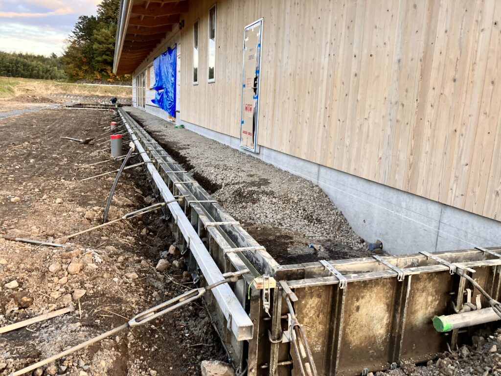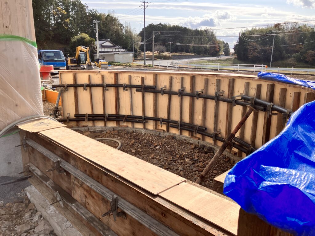 2025-11-19 現場レポート:内田縫製 新工場 内田縫製 新工場 外構工事 内田縫製 新工場は木工事と同時に外構工事に取り掛かりました。 建物の北側にはテラスとアプローチを兼用する洗出しの土間を施工します。まずは洗出しの前に、外枠をつくります。 こちらはR形状の看板になります。まだ鉄筋を組み立てた状態ですが、この後型枠を組み立てます。 こちらが型枠を組み立てた写真です。コンクリートの圧で型枠が動かないように、水道用の配管を使用して曲げ固定をしています。 配管もやわらかすぎず、固すぎずの素材なので、このようなR形状にはとても適した材料です。しっかりと固定できています。 外構工事も始まり、内装工事も仕上げの段階に差し掛かっています。