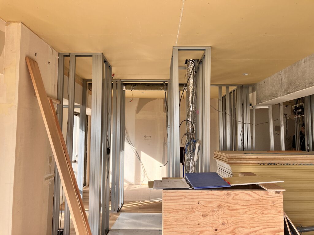 2025-11-17 現場レポート:ショールーム マンションリノベーション マンションリノベーション 大工工事2 床・天井の下地を張り終えて壁の骨組みが立ち上がりました。 マンションは戸建てと違って壁は軽量鉄骨で組むのが基本です。 次は建具枠を取り付けていく作業に移ります。 リビング窓に設置する障子の敷居