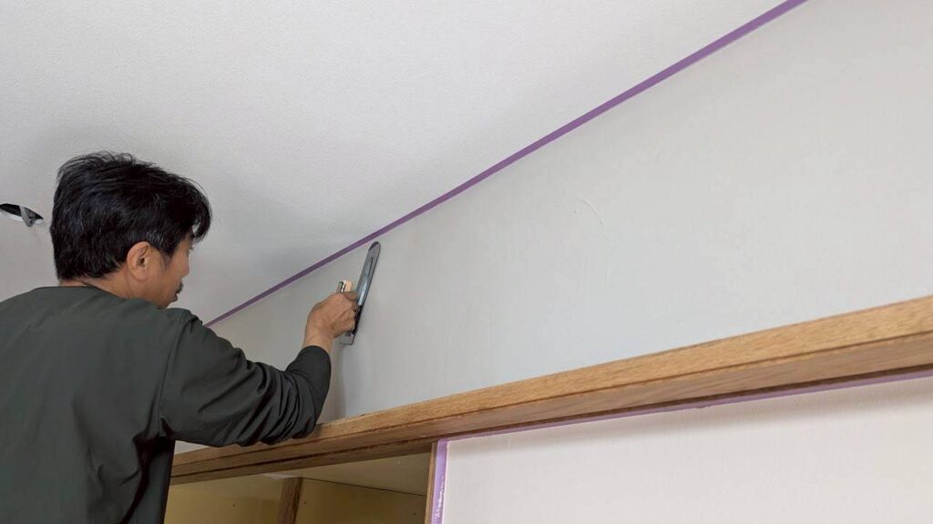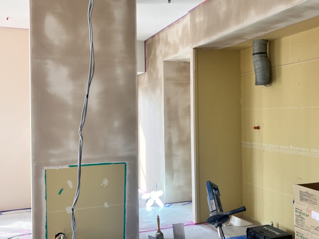 リビングの壁は左官仕上げ。職人さんが丁寧に塗り上げていきます。