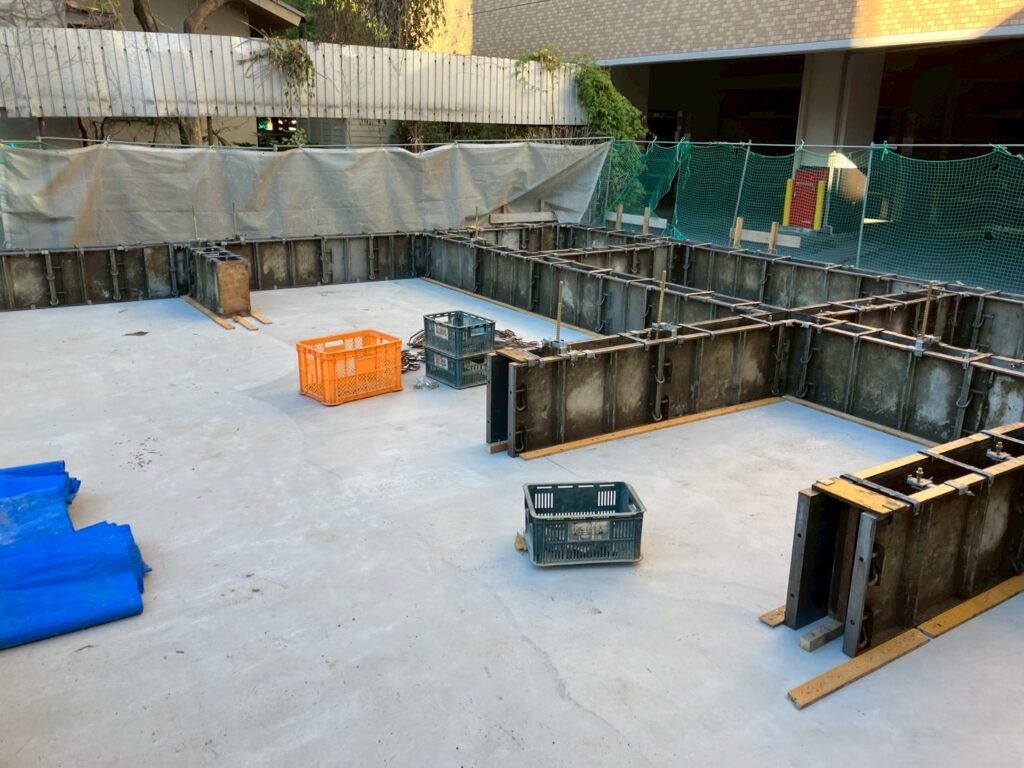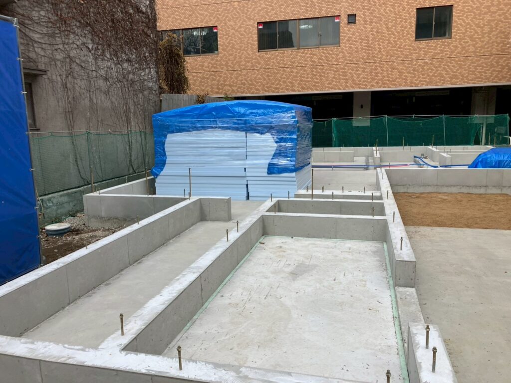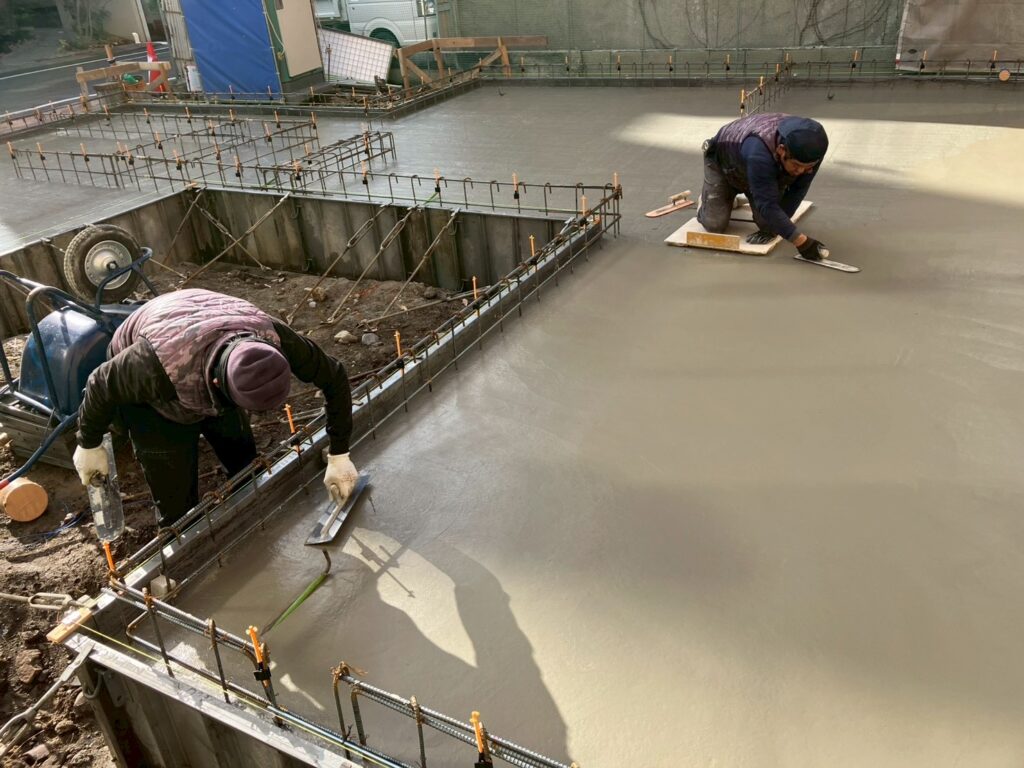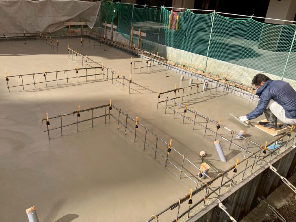 2026-01-13 現場レポート:KK邸 緩やかな片流れ屋根の住宅 KK邸 基礎工事2 配筋検査を無事に終え、基礎モルタルの打設が始まりました。 まずはベース部分から。 打設したモルタルはきれいにコテでならして凸凹なく仕上げます。 ベース部の打設完了後しばらく乾燥させます。 ベース部の乾燥が完了したら次は立ち上がり部です。 このように型枠を組んでそこにモルタルを流し込みます。 立ち上がり部の乾燥も終え、型枠を外すと基礎工事完了です。