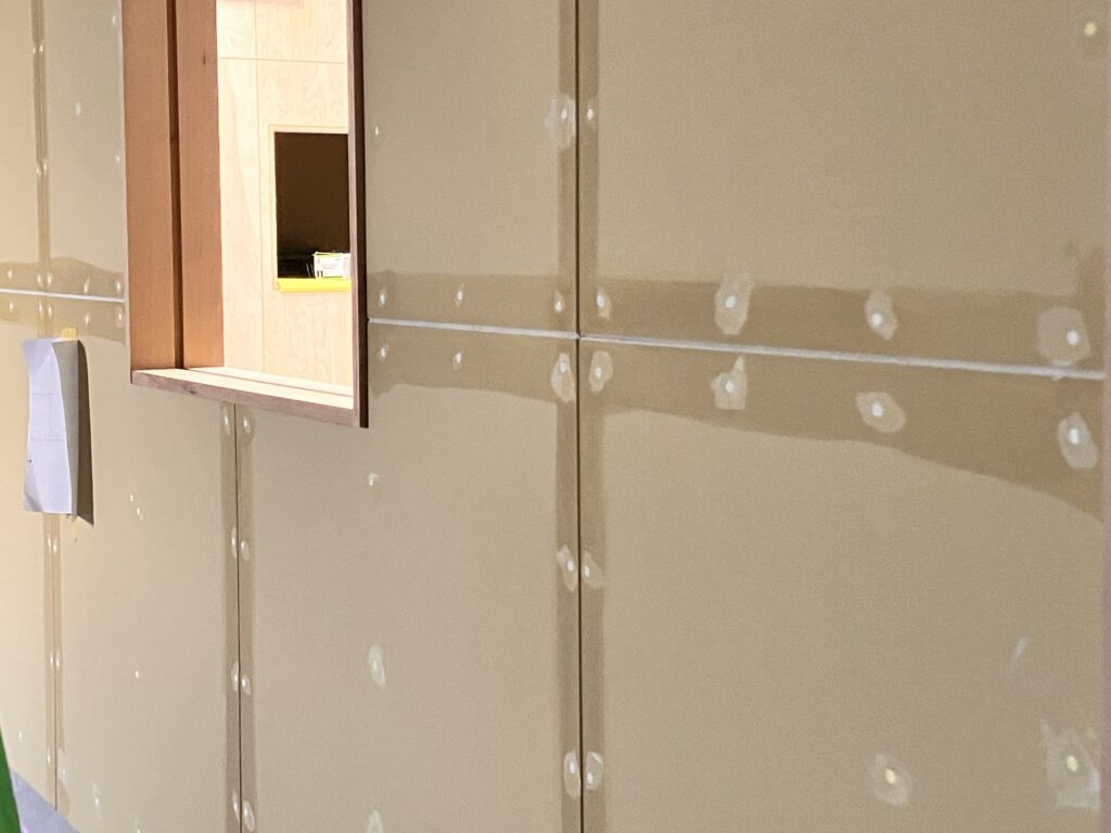 壁・天井の合板や石膏ボードが貼り終わり木工事の完了が近づいてきました。