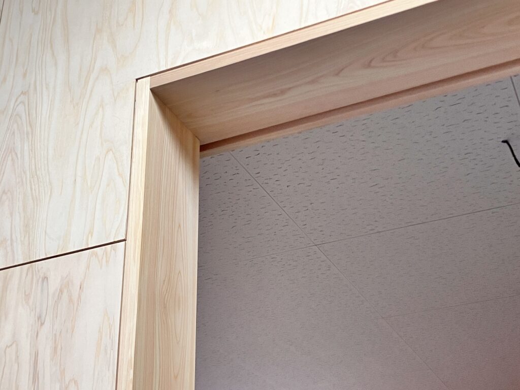 2025-11-26 現場レポート:内田縫製 新工場 内田縫製 新工場 木工事6 引き続き木工事が進んでいます。 壁・天井の合板や石膏ボードが貼り終わり木工事の完了が近づいてきました。 前回製作中だった建具枠の取り付けも無事完了です。