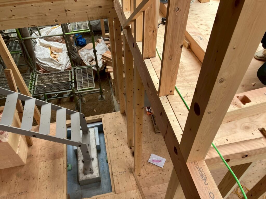 2026-01-22 現場レポート:KK邸 緩やかな片流れ屋根の住宅 KK邸 上棟 KK邸の棟上げが無事完了しました。 1階の柱を建て終えて胴差を設置しています。 家を支える重要な構造部材です。 このように様々な部材が交差して組み上げることでしっかりと家を支えます。 鉄骨階段は上棟のタイミングで設置を行います。 2階も組みあがり屋根を組んでいきます。 2階から屋根までの骨組みが完成。全体の輪郭が見えてきました。 内部はこのようになっています。 断熱材を敷き詰めます。 この日は下地材となるアスファルトルーフィングの施工まで。 仕上げ材となる板金は別日に施工します。 骨組みだけだった壁も合板でふさぎます。 骨組みまでで上棟を終えることもありますが スムーズに進んだおかげでここまで施工できました。 外壁を施工するまでの間、建物を雨から守るためにブルーシートで雨仕舞をして 無事に上棟完了となります。 これからは大工さんによる内部の木工事・外壁工事を行います。