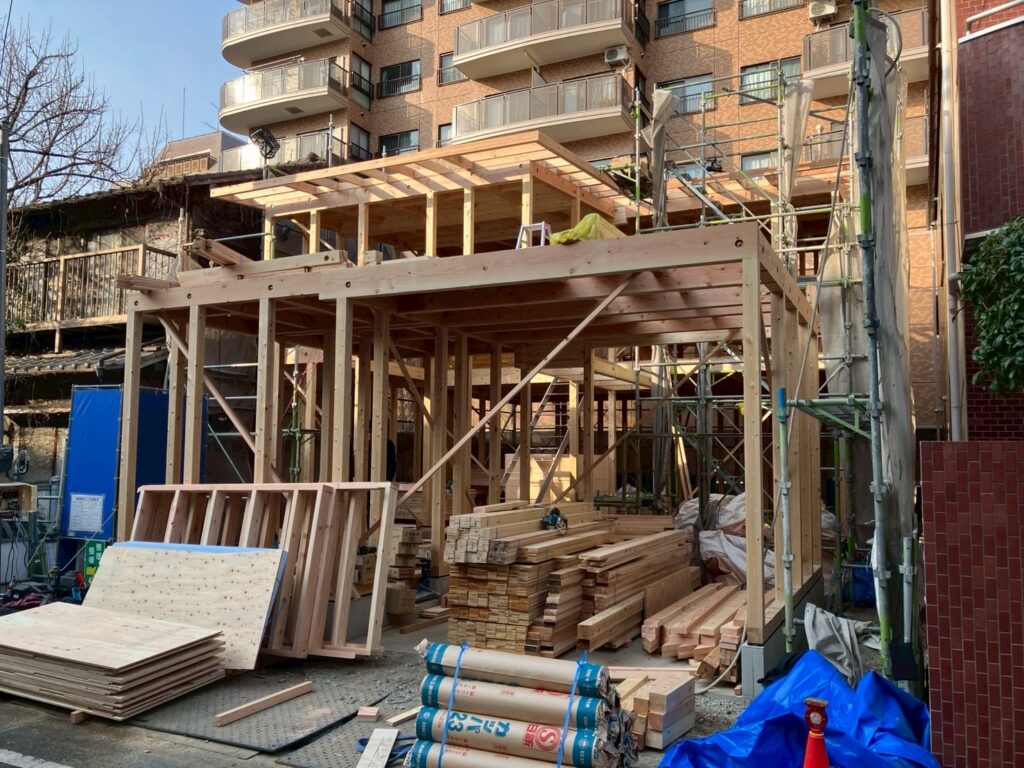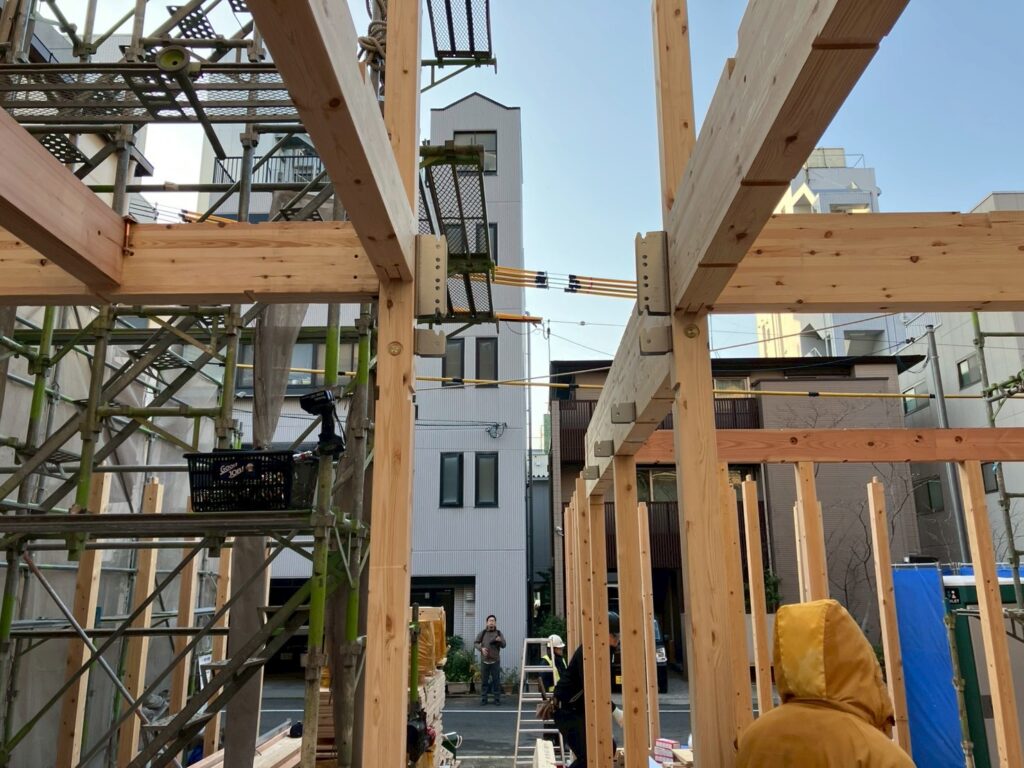 2階から屋根までの骨組みが完成。全体の輪郭が見えてきました。