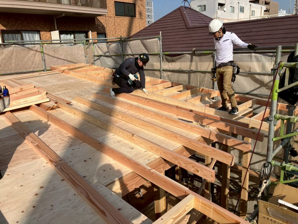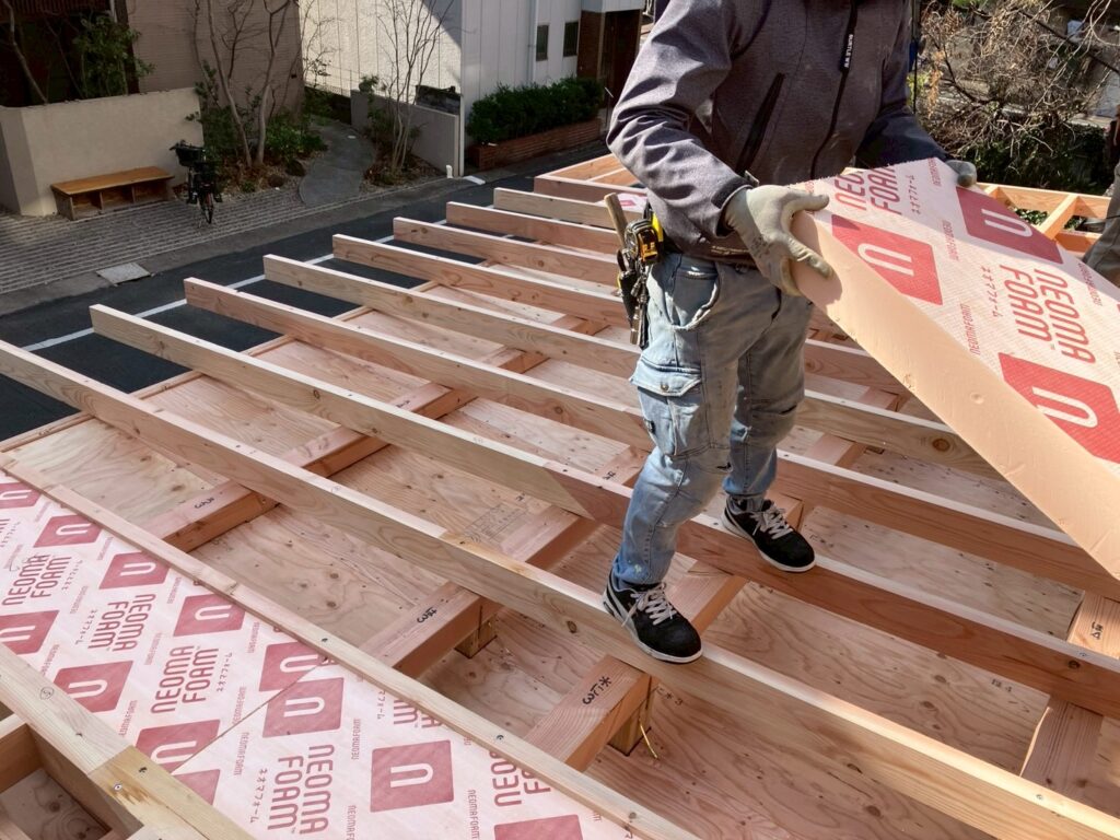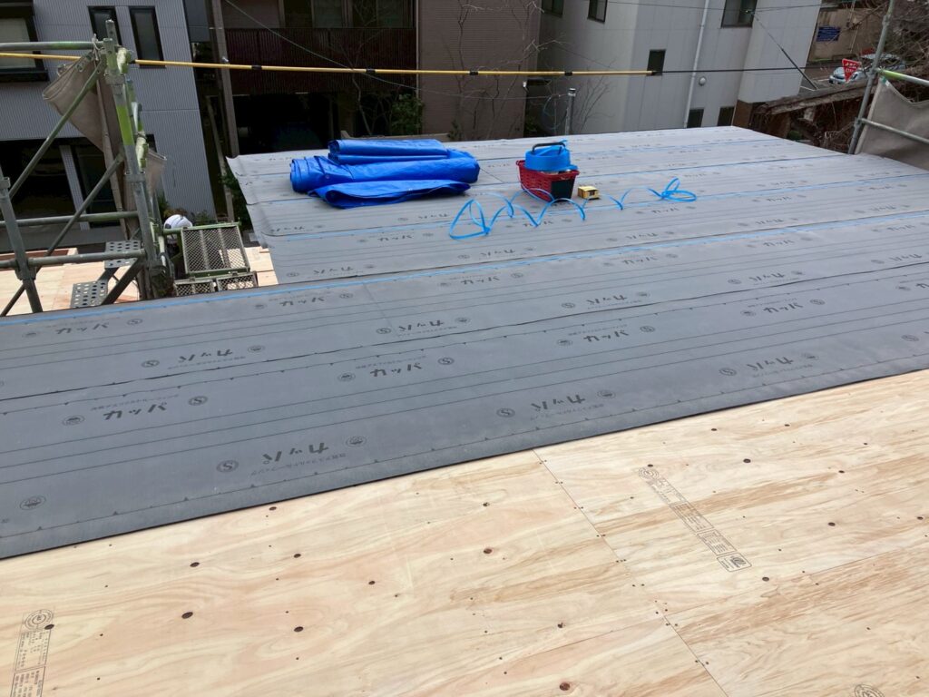 この日は下地材となるアスファルトルーフィングの施工まで。