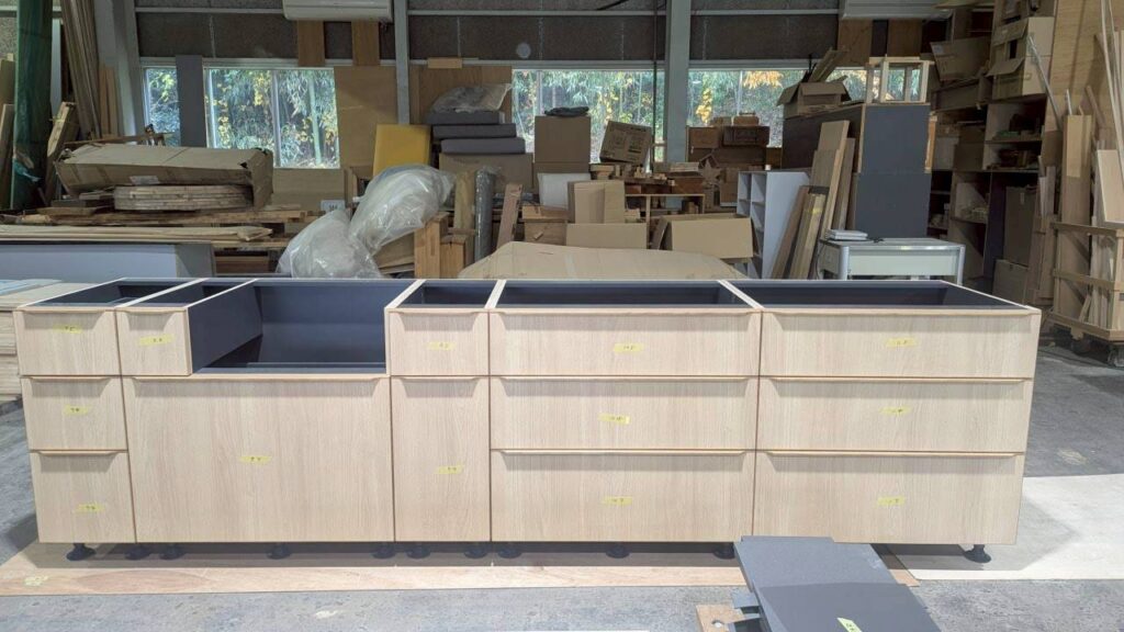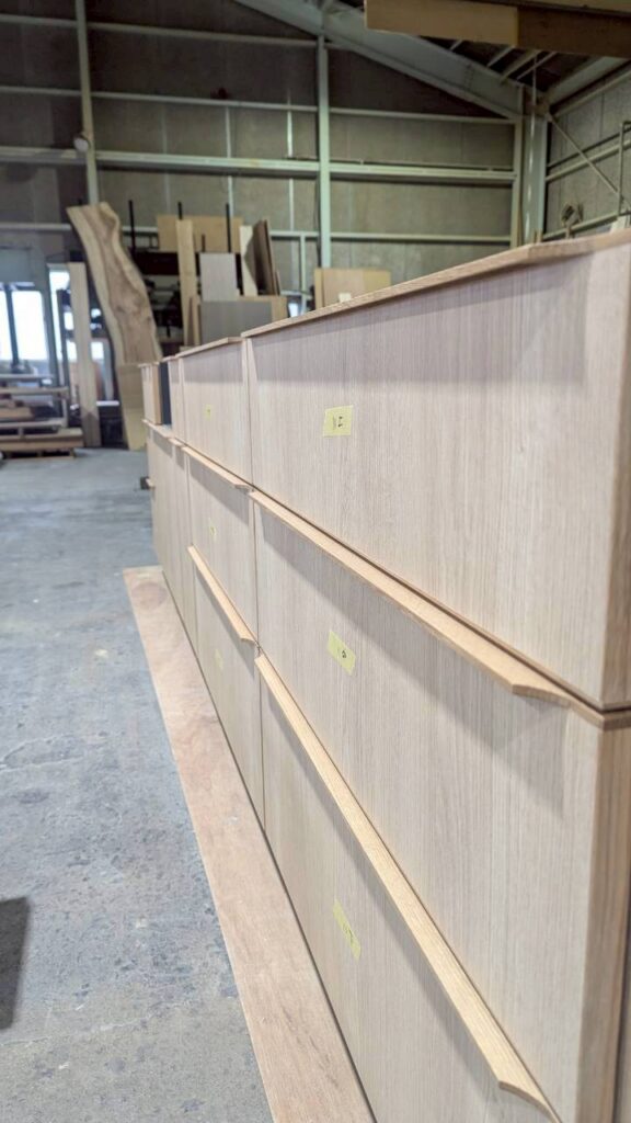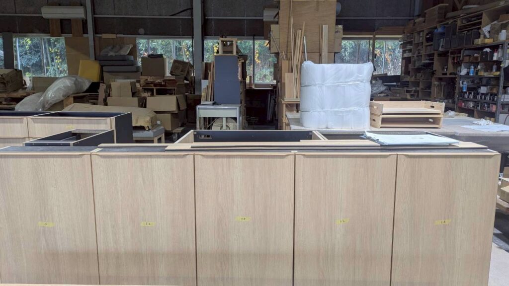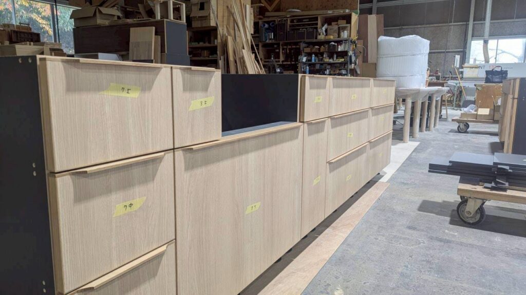2025-11-21 現場レポート:ショールーム マンションリノベーション マンションリノベーション キッチン製作 キッチン・洗面台などはSOWELで製作します。 キッチンの製作が進み完成間近となっています。 このように工場で一度すべての箱を並べる仮組を行い 納まりに問題がないか確認を行います。 こちらはガスコンロを設置する背面壁側のキッチンです。 こちらはペニンシュラキッチン部分をリビング側から見ています。 対面収納をプランしており日用品などをこちらに収納するイメージです。 収納の取っ手はオリジナルで無垢材を加工して製作しました。