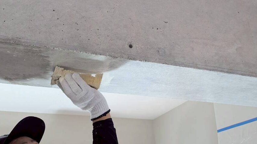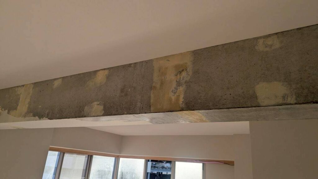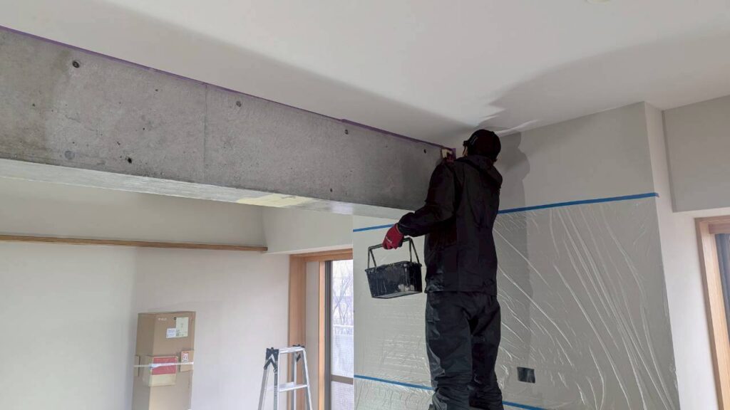 2025-12-24 現場レポート:ショールーム マンションリノベーション マンションリノベーション 内装工事2 リビング梁の塗装工事を行いました。 計画時は天井と同じクロスを巻いてしまう予定にしていましたが 工事途中でせっかくなら梁の風合いを活かしてはどうかということになり方向転換。 既存クロスをはがした状態そのままではあまりきれいではなかったため 梁の質感がわかる程度に薄く塗装をすることにしました。 通常のベタ塗ではないのでこのようにスポンジを使って薄く塗料をつけています。
