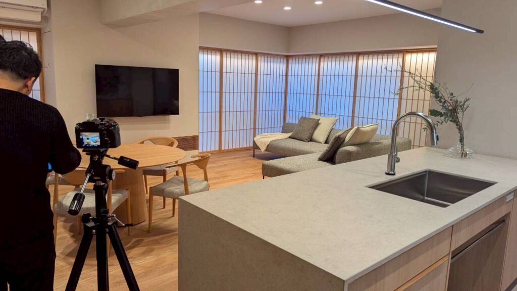 2026-01-29 現場レポート:ショールーム マンションリノベーション マンションリノベーション 完工 マンションリノベーション工事が無事完工しました。 ダイニングセットやソファーも搬入されより具体的に生活がイメージできます。 竣工写真の撮影も行いました。ワンカットずつ細かく調整をしながら一番良い画角を探します。 日が落ちた後の照明の雰囲気も撮影する為、撮影は丸1日かけて行いました。 その際に撮影した写真の1枚です。 そのほかの写真も後日施工事例にUP予定ですのでお楽しみに。