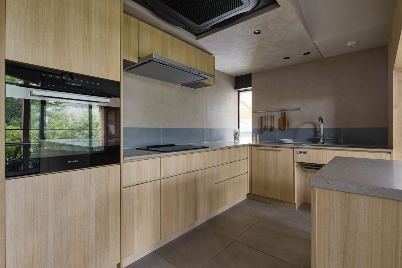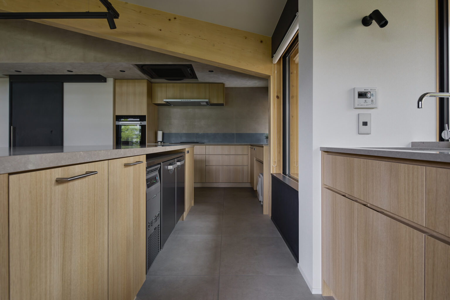 キッチン正面。SOWELのオーダーメイドキッチンです。床は大判のタイルを貼っています。