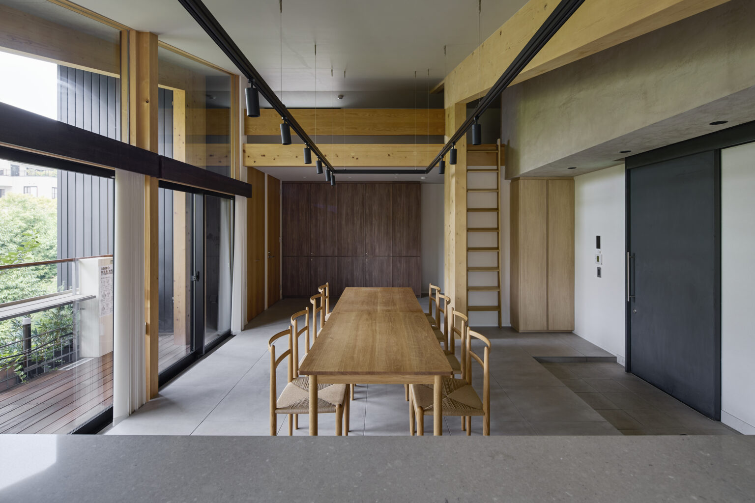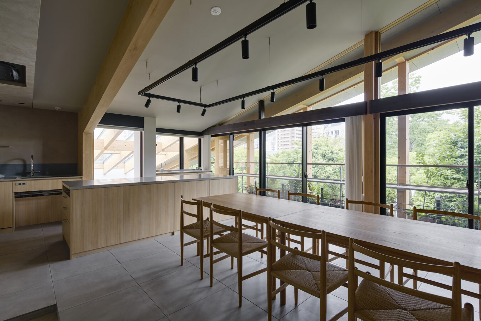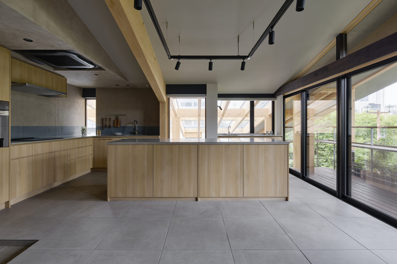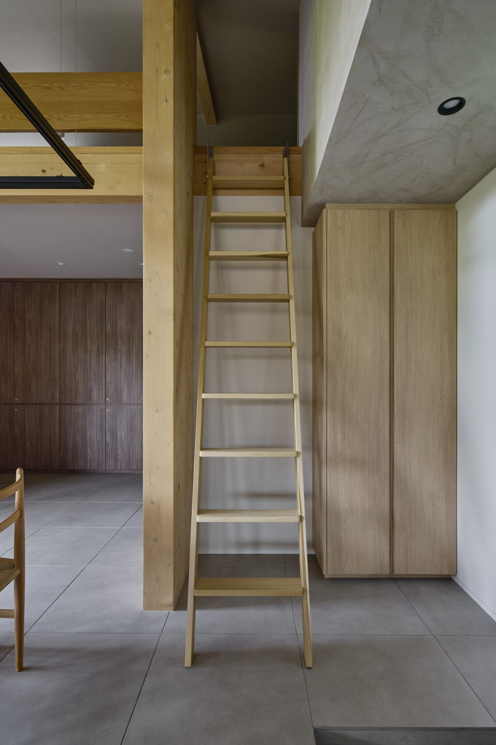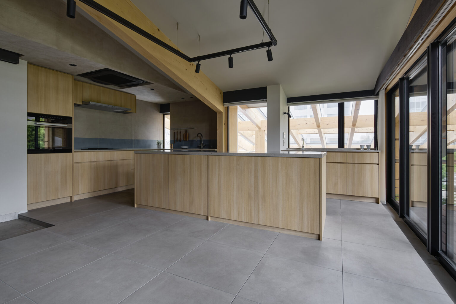 床のタイル貼り、天井の左官仕上げ、構造の木の化粧梁といった様々な材料が取り入れられた空間となっています。
