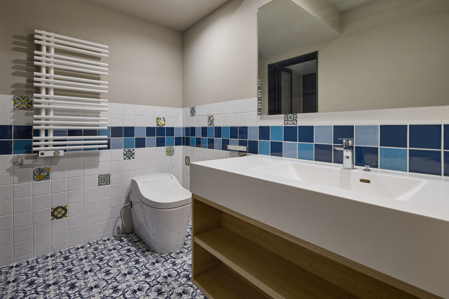 トイレ。手洗いカウンターの高さにタイルが合うように割付を検討しました。