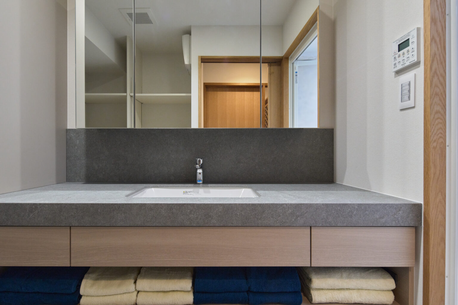 洗面台もSOWELで製作。既存のスペースに合わせて製作するのでサイズに悩むことはありません。