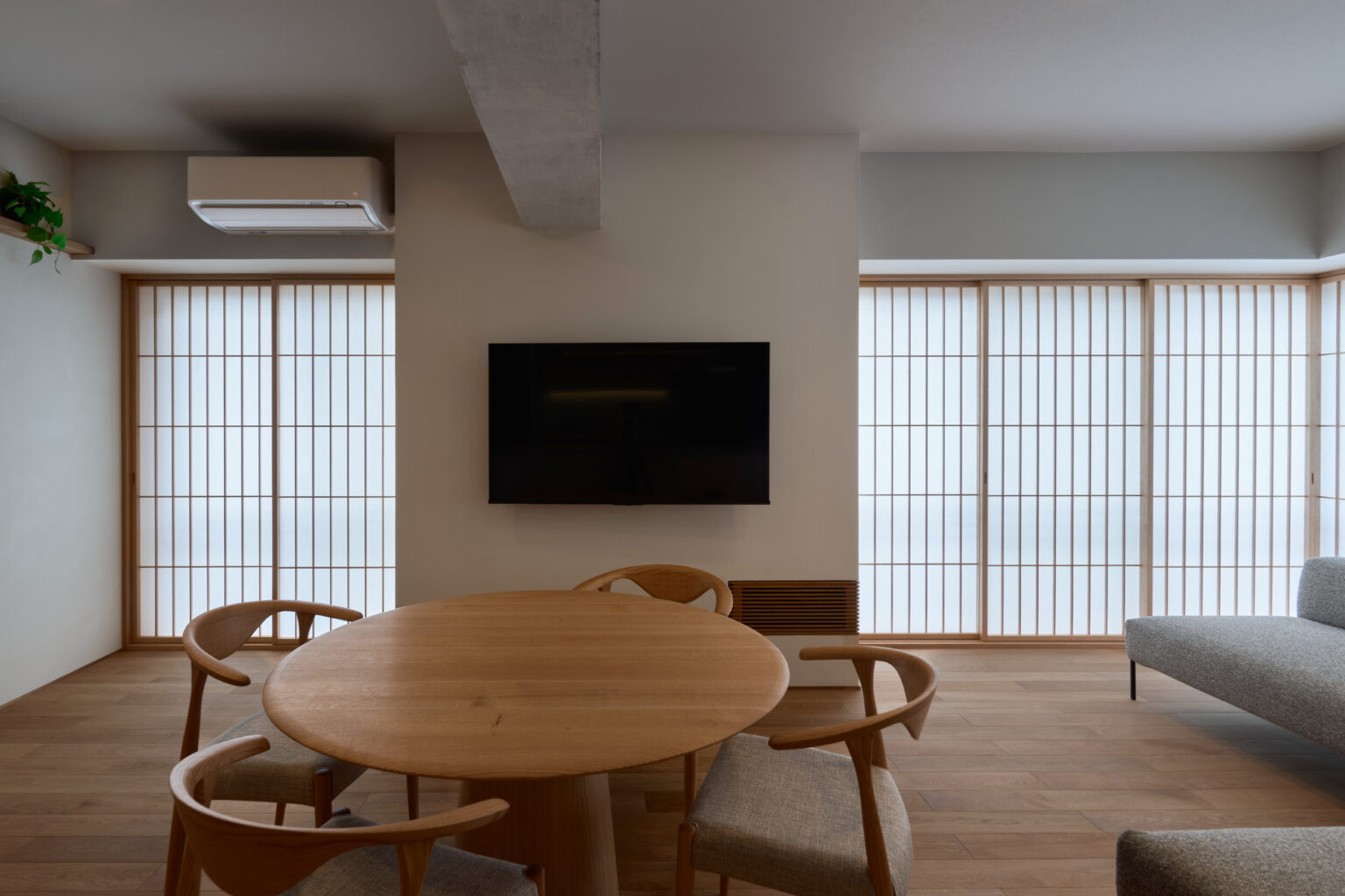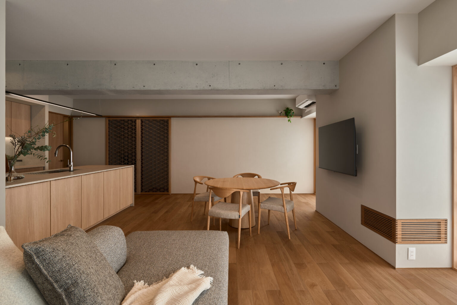 TVの右下に見える格子扉はSOWELで製作したTVボード。壁内に埋め込んでいます。