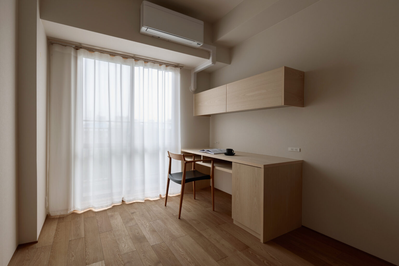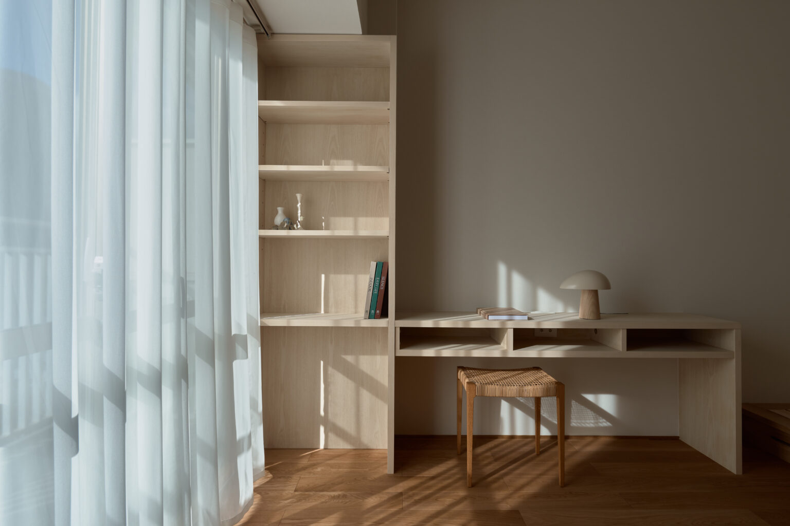もう1部屋のデスクは本棚付き。心地よい日差しに読書が捗りそうです。