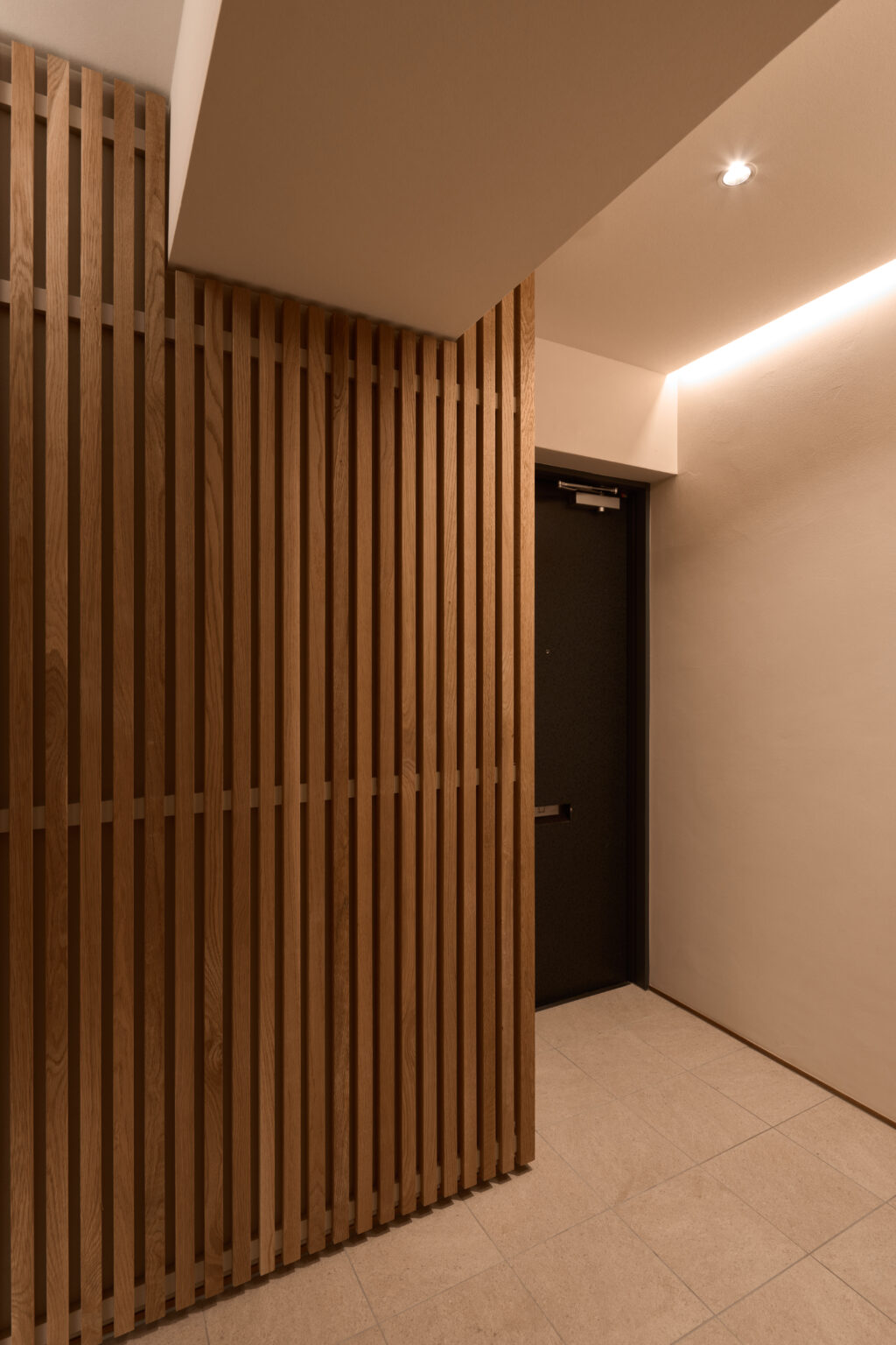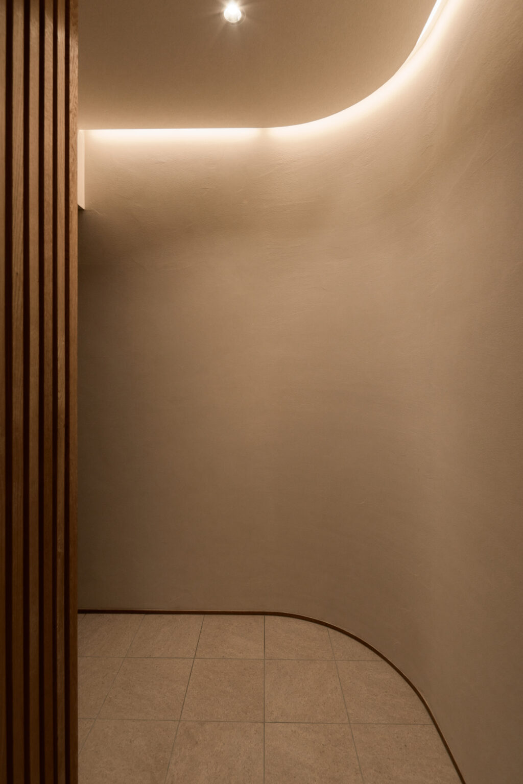 玄関正面の壁はアールに仕上げ、丸みのあるデザインと間接光が柔らかく出迎えます。