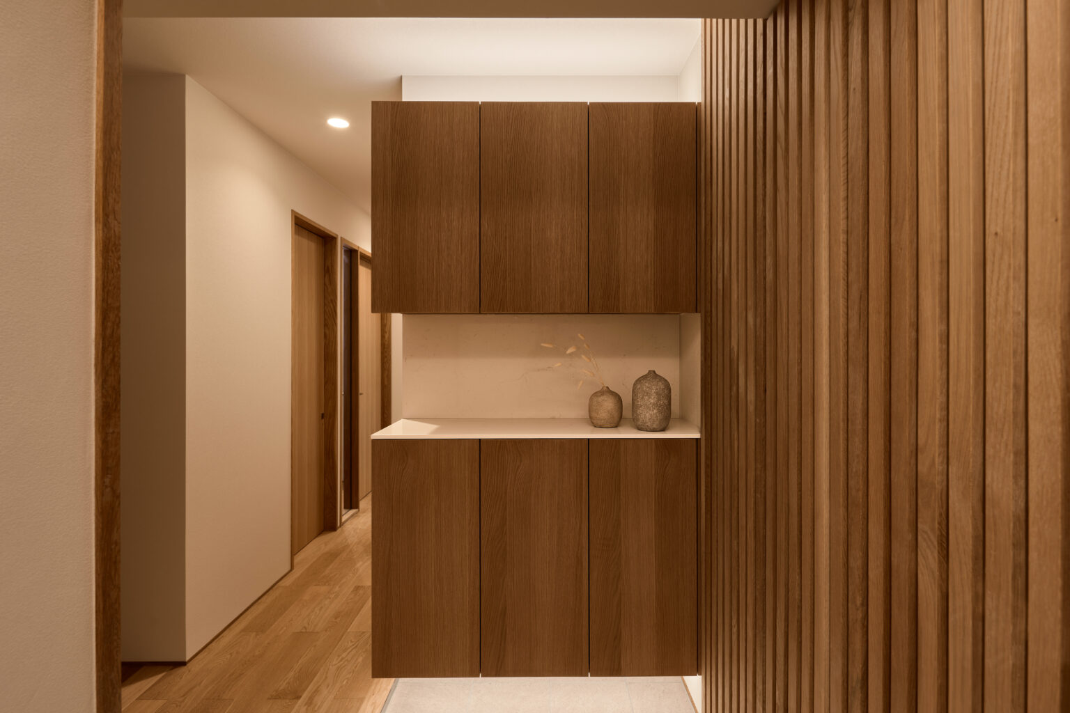 玄関収納の上下にも間接照明を仕込んでいます。