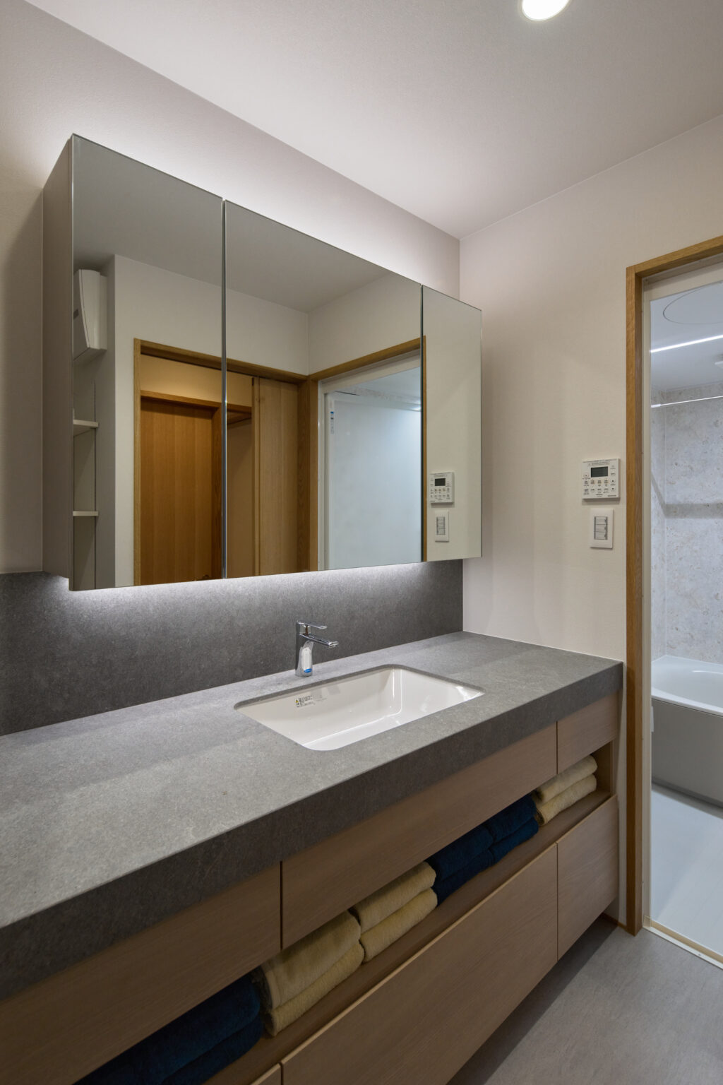 洗面台もSOWELで製作。既存のスペースに合わせて製作するのでサイズに悩むことはありません。