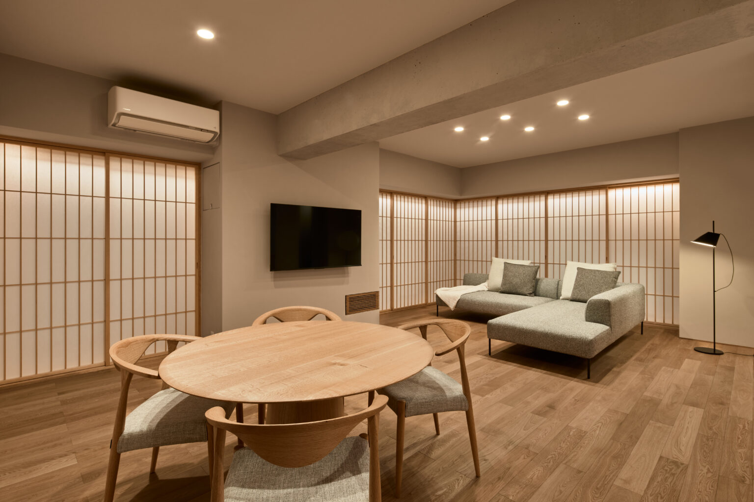 夜には障子を通して間接照明の明かりが室内を優しく照らします。